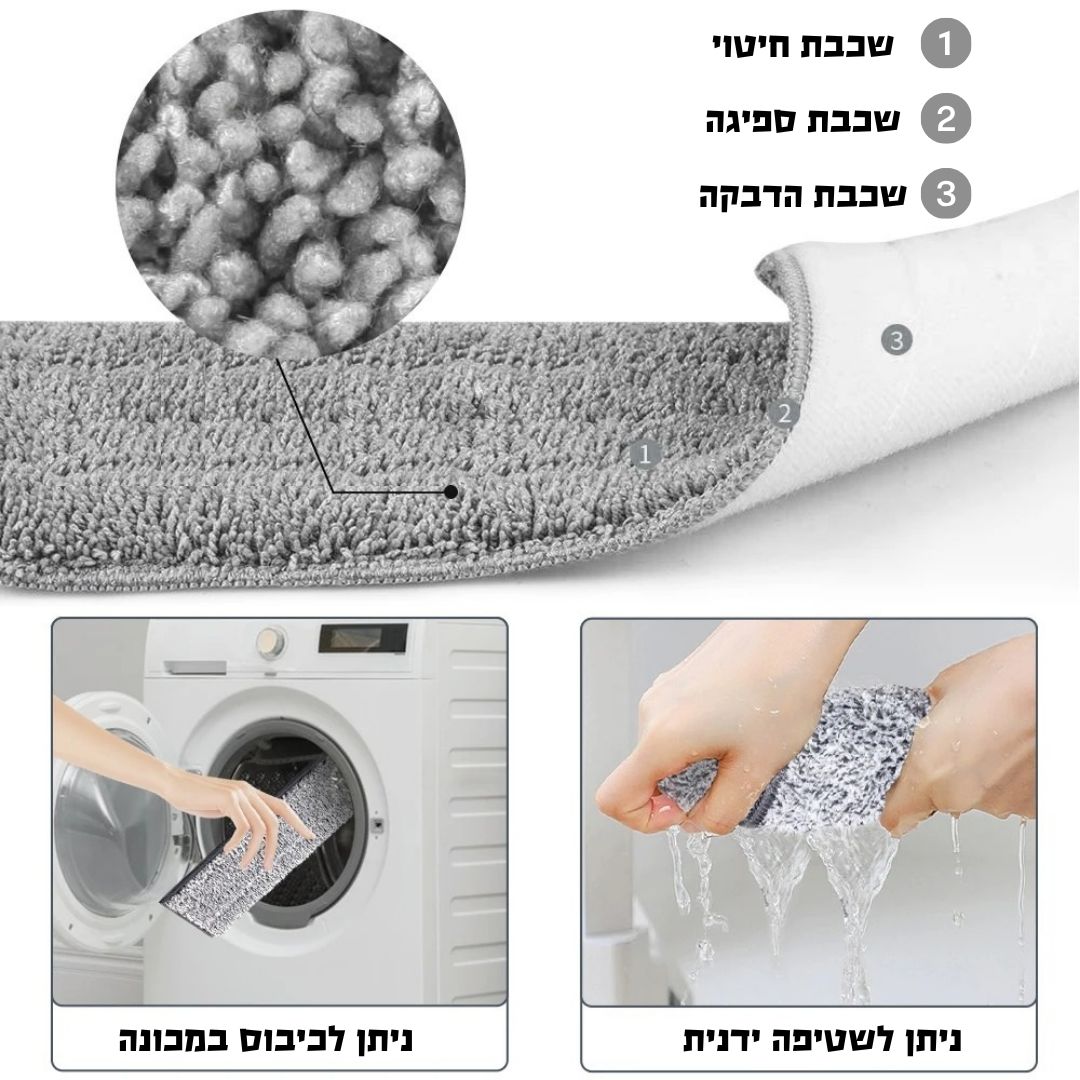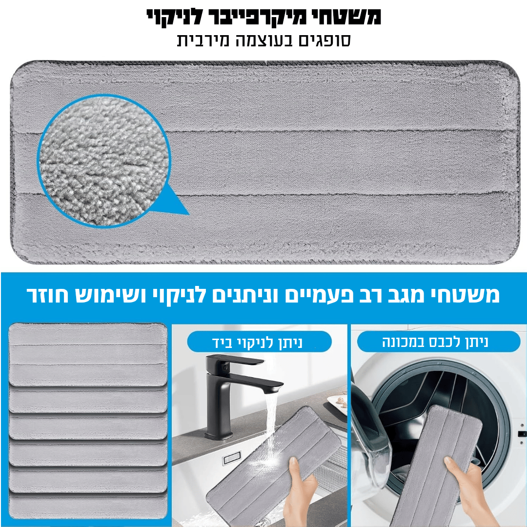 ראש המגב מסתובב 360° ומגיע לכל פינה, קיר או שטח קשה להגעה, והמוט המתכוונן מאפשר עבודה נוחה לכל אחד מבני המשפחה. הפדים עשויים מיקרופייבר איכותי, רב-פעמיים וניתנים לכיבוס, ומספקים ניקוי יבש ורטוב מושלם.